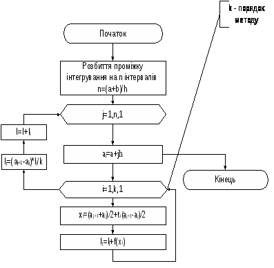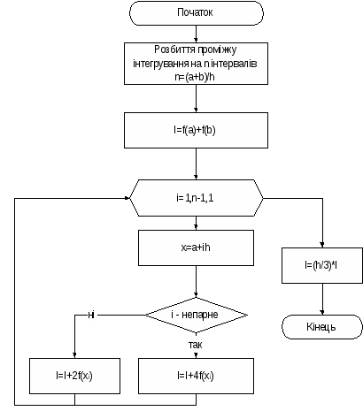 після чого підставляють отримані значення у формулу (3). В кінці оцінюють похибку. У додатку А приведено алгоритм методу Сімпсона.
