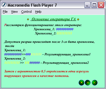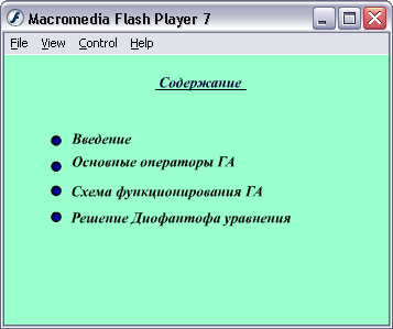 Как вы помните, нашей целью является создание электронного пособия, которое позволило бы достаточно понятно и просто донести до читателя основные понятия и принципы организации генетического алгоритма. Action Script предоставляет прекрасную возможность, организовать красочный, доступный интерфейс и навигацию. И еще один неоспоримый плюс при создании учебника на Action Script: использование готового продукта, как самостоятельную программу (публикация готового продукта с exe расширением).