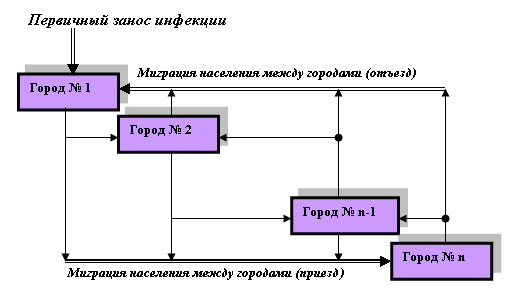 Рисунок 5. Схема развития эпидемии гриппа в системе "n" городов.