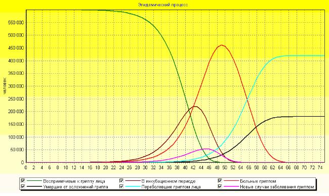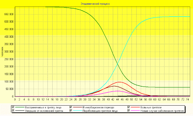 Первые случаи гриппа среди людей, вызванного вирусом ПГ субтипа H5N1, произошли в Гонконге в 1997 году. В той вспышке пострадало 18 человек, все были госпитализированы, при этом 6 из них умерли. Источник инфекции во всех случаях был прослежен специалистами. Установлено, что эти люди имели контакт с больными птицами на фермах (1 случай) и рынках (17 случаев). Ограниченная передача патогенного вируса гриппа типа H5N1 от человека к человеку была зарегистрирована среди сотрудников органов здравоохранения, сельскохозяйственных рабочих на птицефермах и членов их семей. В этой связи представляет интерес вычислительный эксперимент с математической моделью эпидемии гриппа 1-7, в которую нами были "подставлены" условные характеристики вируса типа H5N1 (инкубационный период оценивается от 2 до 5 дней, инфекционный период от 10 до 15 дней, летальность - 30%).