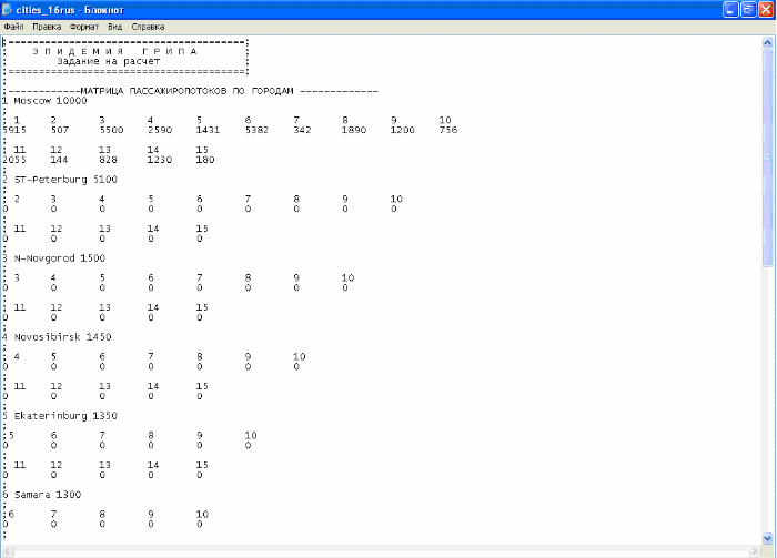 Начало расчетов обеспечивается вызовом файла миграции населения по 16-ти крупным городам России (см. рисунок 7). Файл миграционных потоков населения (ежедневные перемещения) по 16-ти крупным городам России был построен на основании статистических данных полетов самолетов из Москвы в 15 крупных городов по Расписанию на середину лета 2003 года.