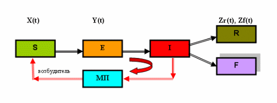 Модель эпидемии гриппа на территории страны. Эта модель отражает процесс одновременного распространения гриппа среди населения нескольких городов страны (см. рисунок 5). За счет непрерывного движения источников инфекции (лиц в инкубационном периоде) возможны новые случаи заражения лиц из группы риска X(t) в каждом городе. Очевидно, что в каждом случае сформируется своя "локальная" эпидемия, которая будет "подпитывать" другие города за счет постоянной миграции населения между ними.