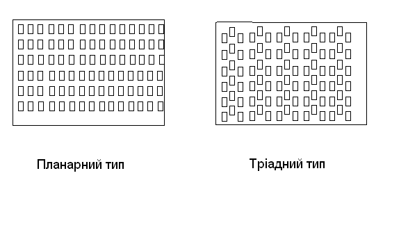 Кольорові дисплеї на електронно-променевих трубках бувають планарного і тріадного типу: