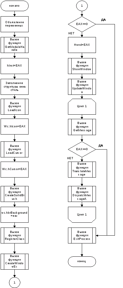 В сегменте кода вызывается функция GetModuleHandle, при помощи которой получаем дескриптор приложения, после чего помещаем его в eax. Далее заполняем структуру окна стиль. Подключаем процедуру обработки сообщений. Загружаем иконку и курсор с помощью вызова функций LoadIcon и LoadCursor. Задаем цвет фона окна с помощью функции CreateSolidBrush. Регестрируем класс окна с помощью функции RegisterClass. Далее создаем окно зарегестрированного класса с помощью функции CreateWindowEx. Сравниваем eax с нулем. Если он равен 0, то переходим на метку END_LOOP. Помещаем дескриптор окна в регистр eax. Отображаем созданное окно с помощью функции ShowWindow и перерисовываем видимую часть окна при помощи UpdateWindow. Далее следует цикл обработки сообщений, после которого вызывается функция ExitProcess.