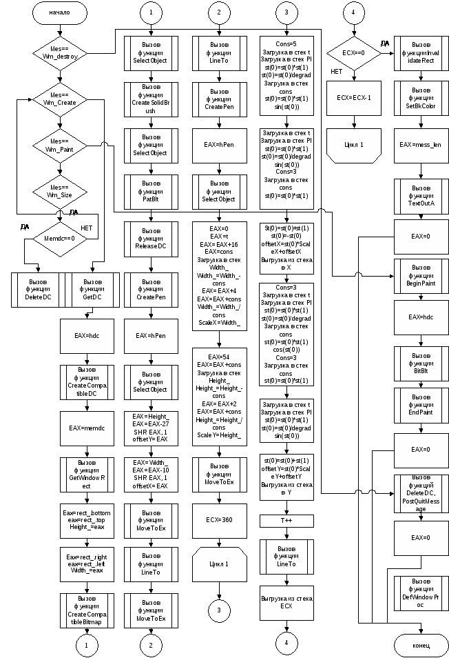 После главной функции следует процедура окна. Полученное сообщение сравнивается с сообщениями WM_DESTROY, WM_CREATE, WM_SIZE, WM_PAINT. В случае соответствия следует переход на соответствующую метку.