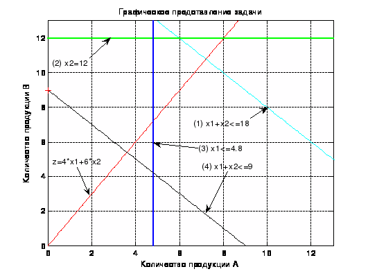 Наилучшее (оптимальное) решение отмечено красным крестиком. Максимальная прибыль достигается в точке (0, 9), А=0, В=9; при нахождении оптимального решения данной задачи следует помнить, что количество продукции (равно как и количество ресурса) целое число.