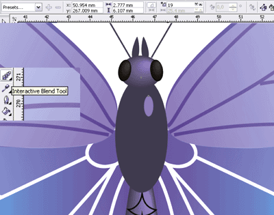 10. Все части тела бабочки можно сделать следующим способом: копированием каждой детали – уменьшить, залить нужным цветом. Затем выделяем и применяем Interactive Blend Tool, этим способом нарисованы голова, грудь, брюшко и глаза бабочки.