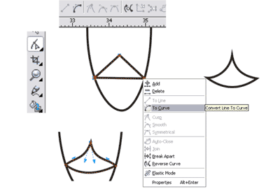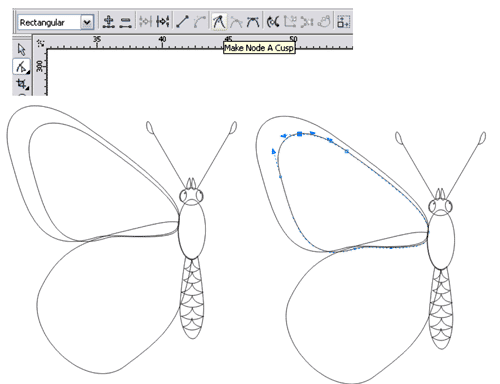 5. На брюшке бабочки есть рисунок, получается он следующим образом: с помощью Bezier Tool рисуем треугольник, а затем, используя инструменит Shape Tool (F10), придаем ему изогнутую форму. Выделяем все точки, щелкаем по ним правой кнопкой мышки и выбираем to Curve. Полученную форму мы копируем по высоте, затем подгоняем по форме животика, растягивая или сужая, где требуется.