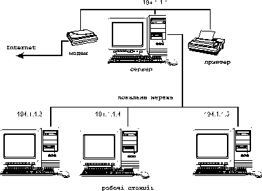 У цій мережі мережі, об’єднано декілька комп’ютерів, принтер, модем для доступу в Internet. Розглянемо, що нам необхідно для успішного функціонування мережі на основі протоколу TCP/IP. Насамперед потрібно визначитися з такими параметрами: