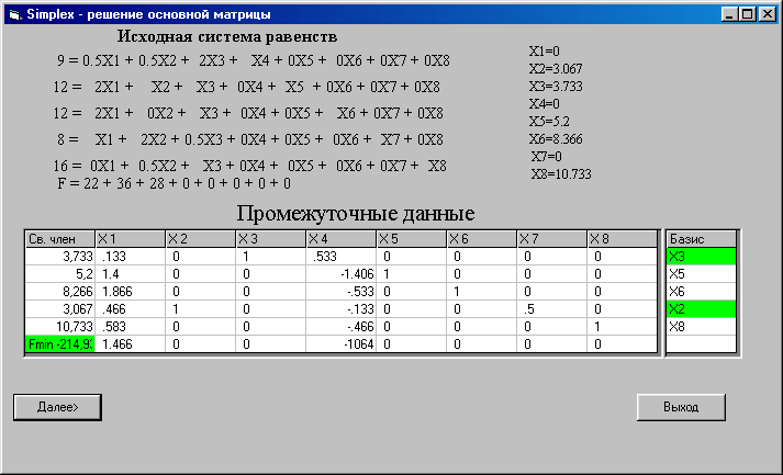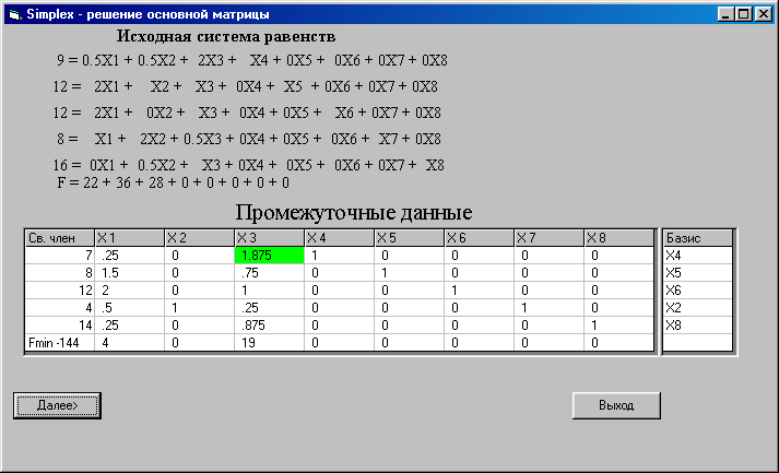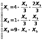 Коэффициент при X>2> функции F отрицателен. Поэтому можно и дальше уменьшать целевую функцию F, увеличивая X>2>.однако X>2> можно увеличивать не более, чем до 1: это следует из уравнения X>5>=3-3 X>2>+ X>4> ( если X>2>>1, X>4>=0, то X>5><0 ). Подстановка X>2>=1 в другие уравнения дает X>1>=4 и X>3> =9. Еще раз выразим базисные переменные и F через небазисные: