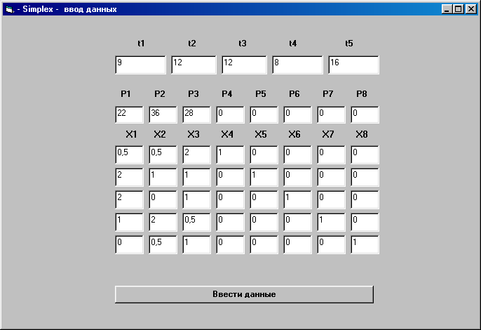 Решаем задачу симплекс методом. Вводим дополнительные неопределенные данные – (Х4,Х5,Х6,Х7,Х8), тогда система ограничений имеет следующий вид.