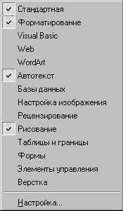 Чтобы включить или выключить одну из панелей инструментов, щелкните по имени этой панели в контекстном меню (любой кнопкой мыши). Те панели, которые в данный момент имеются на экране, помечены галочкой.