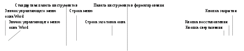 На рис.1.1 показан общий вид окна Word, появляющегося на экране после запуска программы, и отмечены его главней части, большинство из которых являются стандартными для приложений Windows 95.