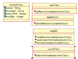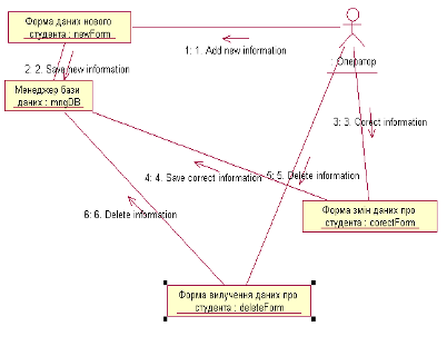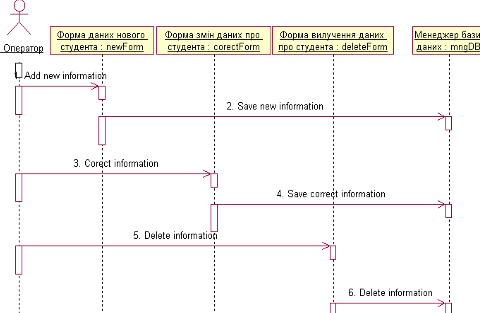 На наступному кроці була створена діаграма послідовностей дій (Sequence diagram) для прецеденту „заносити інформацію про студентів” актора „оператор”, яка представлена на малюнку 3. На ній можна побачити класи та операції, які застосовуються до кожного з них у суворій послідовності. Цей тип діаграми не акцентує увагу на конкретній взаємодії, головний акцент приділяється послідовності прийому/передачі повідомлень.
