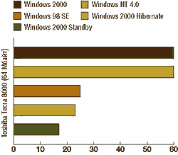 Рис.1.5. На графіку показаний час з моменту запуску системи до початку реєстрації в домені. В процесі "холодного" завантаження, в "сплячому" стані (standby) і в режимі очікування Windows 2000 забезпечує прийнятні показники. (Чим нижче значення, тим краще.)