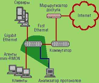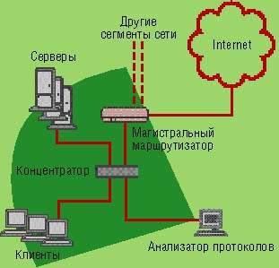 Иерархическая топология корпоративных сетей с магистральными каналами Gigabit Ethernet и выделенными портами коммутаторов на 10 или даже 100 Мбит/с для отдельных клиентских систем, позволила увеличить максимальную пропускную способность, потенциально доступную пользователям, как минимум в 10—20 раз. Конечно, в большинстве корпоративных сетей существуют узкие места на уровне серверов или маршрутизаторов доступа, поскольку приходящаяся на отдельного пользователя пропускная способность существенно меньше 10 Мбит/с. В связи с этим замена порта концентратора с пропускной способностью 10 Мбит/с на выделенный порт коммутатора на 100 Мбит/с для конечного узла отнюдь не всегда приводит к значительному увеличению скорости. Однако если учесть, что стоимость коммутаторов в последнее время снизилась, а на большинстве предприятий проложен кабель Категории 5, поддерживающий технологию Ethernet на 100 Мбит/с, и установлены сетевые карты, способные работать на скорости 100 Мбит/с сразу после перезагрузки системы, то становится ясно, почему так нелегко сопротивляться искушению модернизации. В традиционной локальной сети с разделяемой средой передачи анализатор протоколов или монитор может исследовать весь трафик данного сегмента сети.