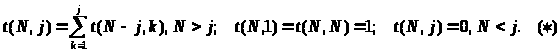 Теперь очевидно, что если мы имеем возможность завести двумерный массив размером NN, и будем заполнять его в порядке возрастания номеров строк, то задача будет легко решена. Однако легко заметить, что решения части подзадач никак не участвуют в формировании решения. Например, при вычислении количества разбиений числа 10 на слагаемые будут получены, но не использованы значения t(9, j) для j = 2..9 и т. д. Для того чтобы не производить лишних вычислений, применим динамическое программирование “сверху вниз” (все предыдущие задачи решались “снизу вверх”). Для этого задачу будем решать все же рекурсивно, используя формулу (*), но ответы к уже решенным подзадачам будем запоминать в таблице. Первоначально таблица пуста (вернее заполним элементы, значение которых по формуле () равно 0 или 1, а остальные значения, например, числом -1). Когда в процессе вычислений подзадача встречается первый раз, ее решение заносится в таблицу. В дальнейшем решение этой подзадачи берется из таблицы. Таким образом мы получили прием улучшения рекурсивных алгоритмов, а “лишние” подзадачи теперь решаться не будут.