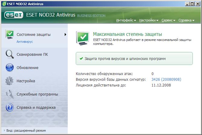 Главное окно антивируса ESET NOD32 вопросов ни у кого не вызовет: интерфейс прост и незамысловат, все на русском языке. Все команды выполнены в виде интуитивно понятных гиперссылок. Интерфейс предусматривает два режима: обычный и расширенный. В обычном режиме отображения малоподготовленный пользователь получает доступ лишь к основным, наиболее простым в использовании функциям администрирования системы защиты. Тогда как в расширенном режиме, который больше подходит для опытных пользователей, становится доступна настройка всех параметров защиты и служебных утилит.