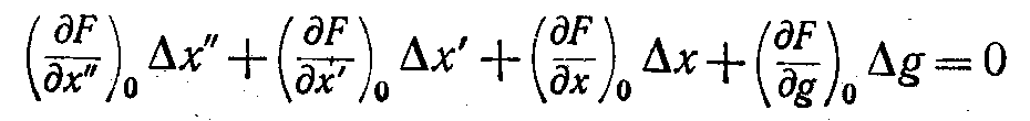 В левой части этого равенства не выписаны члены, содержащие отклонения g и x и их производные в степени выше первой. Частные производные в левой части этого уравнения представляют собой некоторые числа, величины которых зависят от вида функции F(x", x', x, g) и значений координат g0 и х0.
