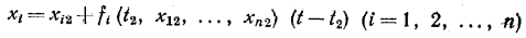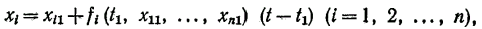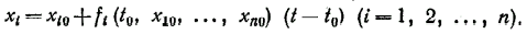 причем t0, xi0 (i=1, 2,…, n) называются начальными значениями для решения x1(t), …, xn(t), а эти условия – начальными условиями. Если ввести в рассмотрение (n+1)-мерное пространство с координатами t, x1,…, xn, то совокупность n функций xi=xi(t) будет представлять линию в n-мерном пространстве. Начальные значения t0, x10,…, xn0 представляют собой точку в этом пространстве.