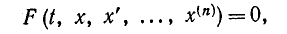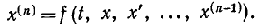 называется дифференциальным уравнением n-го порядка. Решением дифференциального уравнения называется функция x=x(t), определенная на некотором интервале t, которая, будучи подставлена в это уравнение, обращает его в тождество на всем интервале . Это уравнение можно рассматривать как функцию, определяющую неявно производную n-го порядка x(n). При определенных условиях его можно решить относительно x(n):