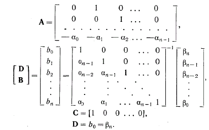 Значит, bi можно определить, умножив обе части этого выражения на обратную матрицу коэффициентов. Согласно полученным выражениям, одна из форм матриц A, B, C, D для системы вида «вход–состояние–выход» имеет вид