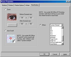 У драйвер Intellimouse 2.0, окрім стандартних функцій попередніх версій драйверів миші, Microsoft додала і декілька нових цікавих можливостей. Одна з них називається Clicklock, тобто блокування натиснення. Вона дозволяє перетягувати елементи, не утримуючи ліву кнопку натиснутої постійно. Можна набудувати драйвер так, щоб вам було зручно працювати, вказавши, як довго ліва кнопка повинна залишатися в натиснутому стані, щоб ця функція включилася. А ще можна вказати драйверу, щоб при натисненні на кнопку-коліщатко він ігнорував всі функції, специфічні для конкретного застосування, а замість цього у всіх застосуваннях Windows виконував одну з наступних дій: