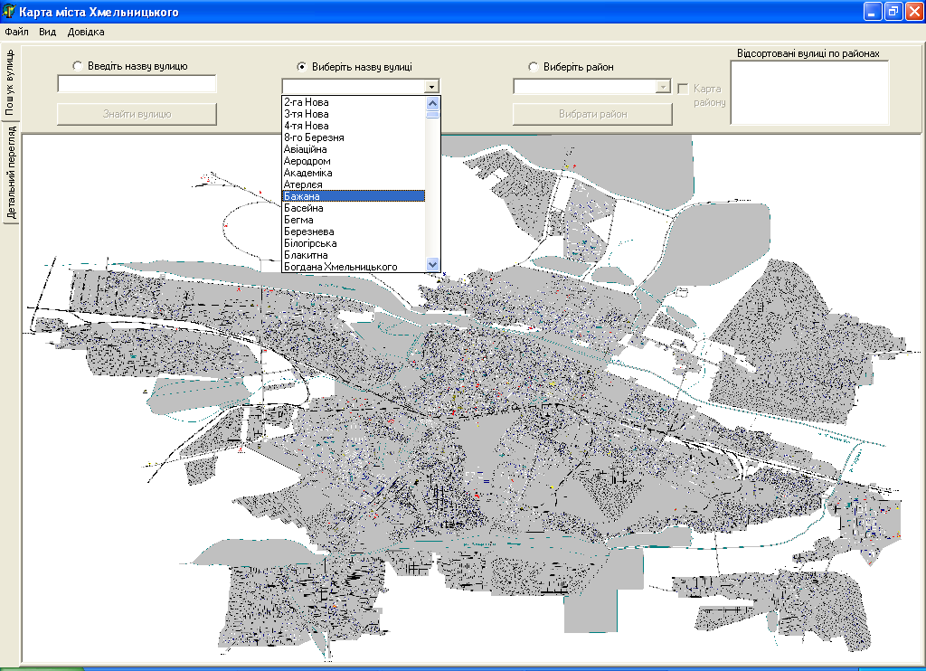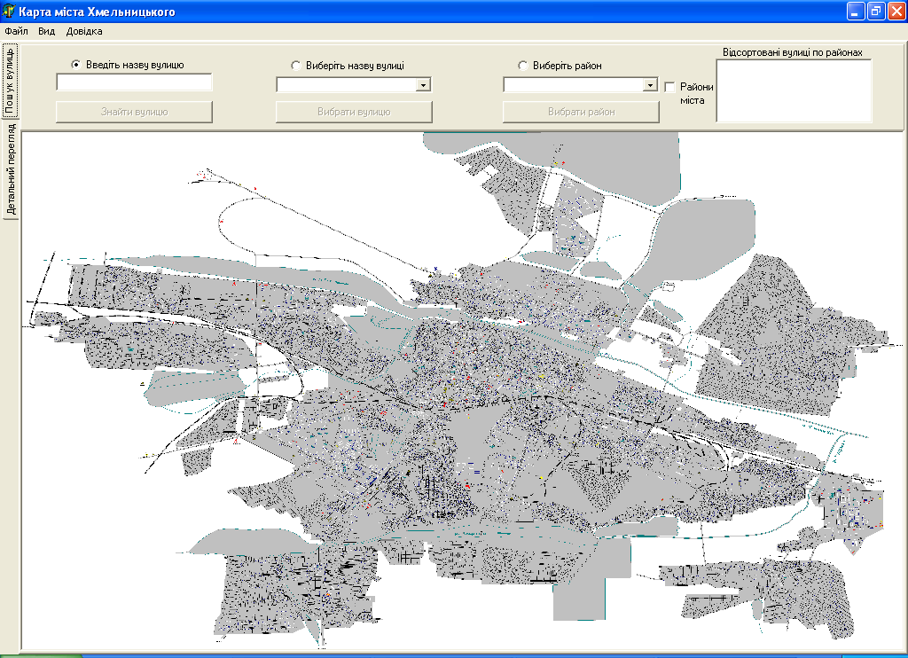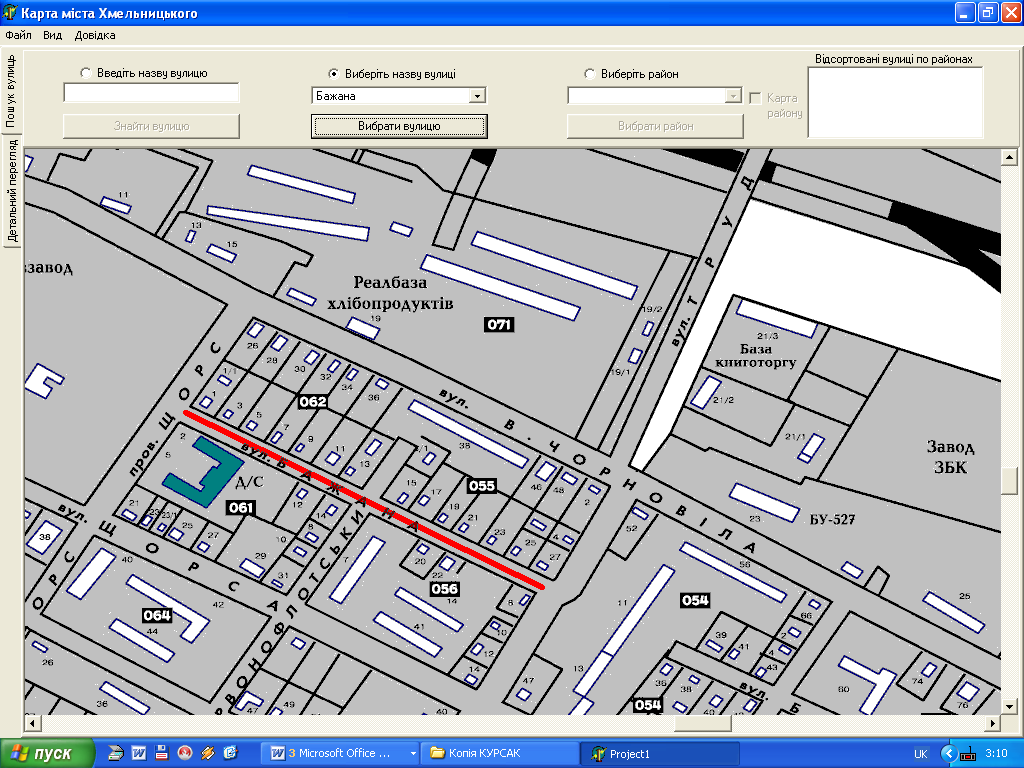 При введені назви вулиці вона порівнюватиметься зі списком вулиць які знаходитиметься в масиві, і якщо назва вулиці яка була введена співпадає з назвою вулиці, яка розмішується в масиві, то на екран виводитиметься вулиця замальована в червоний колір, вона буде мерехтіти для того щоб користувач швидше звернув на неї увагу. Якщо назва вулиці не співпаде, то на екран програма виводитиме повідомлення. Саме ж переміщення на вказану вулицю здійснюватиметься за допомогою горизонтальної та вертикальної ліній прокрутки. Щоб знайти вулицю горизонтальну і вертикальну лінії прокрутки присвоюється значення першої точки по вісі координат Х та У. Потім від першої точки знайденої вулиці відніматиметься певне відхилення, для зручного виведення на екран вулиці. Коли ж вулиця знайдена вона замальовується у червоний колір. Пропадає та з’являється за рахунок “вічного циклу”, тобто таймера. В ньому йде проста перевірка. Якщо вибравши певну вулицю лінія загорілась тоді її гасимо і знову засвічуємо. За допомогою цього методу ми зациклюємо показ лінії на екрані. Для того що вивести наступну вулицю на монітор необхідно спочатку очистити попередню. В підтверджені вибору наступної вулиці існує команда яка очищує попередню вулицю.