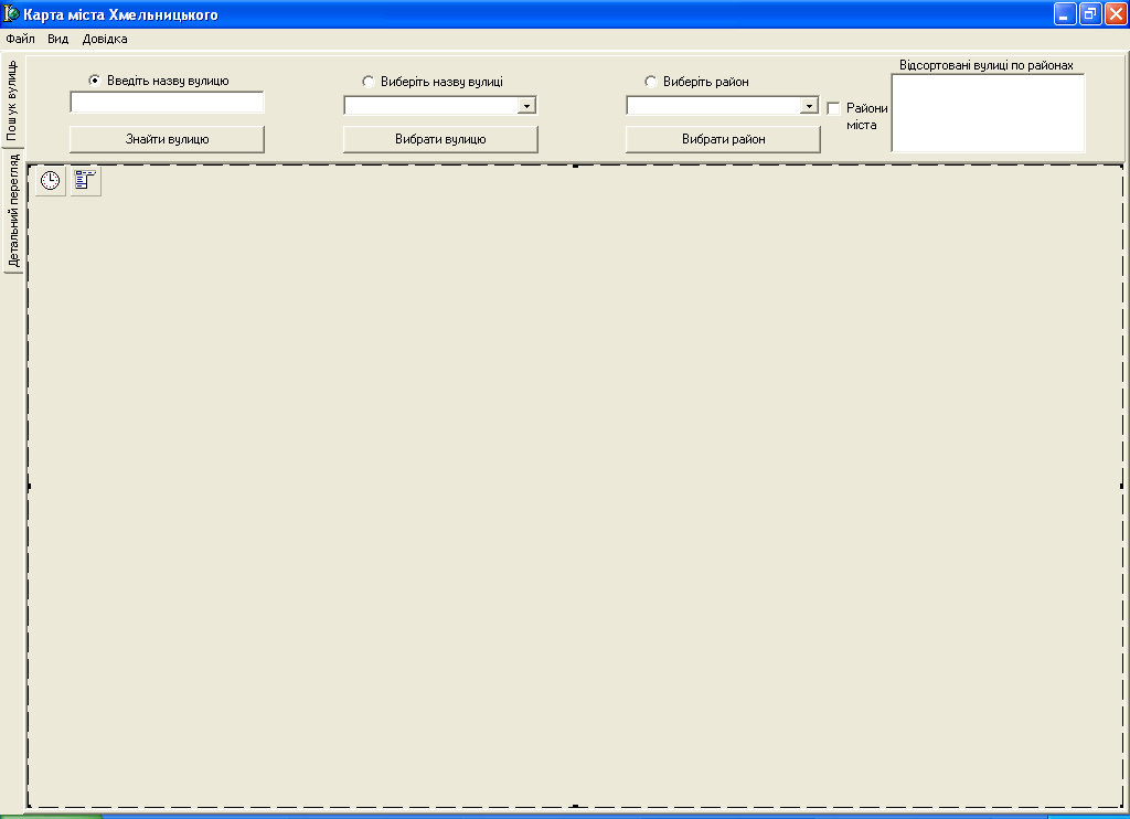 Для того щоб можна було знайти потрібну вулицю необхідно спочатку ввести її назву у спеціальне поле для пошуку, після цього натиснути кнопку яка знаходиться під полем введення, тоді вулиця з’явилась на екрані, але до того кнопка пошуку вулиці являється неактивною, тільки при введені першого символу назви вулиці кнопка активізується. При введені наступної вулиці попередня буде знищена.