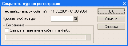 В процессе длительной эксплуатации системы в журнале регистрации может накапливаться значительное число записей. Поэтому поддерживается возможность сокращения журнала регистрации и удаления записей, ставших неактуальными. При сокращении журнала регистрации можно записать удаляемые события в файл, если предвидится необходимость их анализа в будущем: