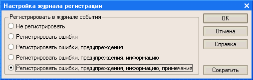 Существует возможность настройки уровня событий, отображаемых в журнале регистрации: