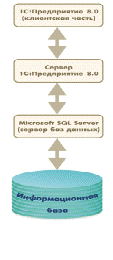 На одном из компьютеров работает сервер 1С: Предприятия 8.0. Программа, работающая у пользователя, взаимодействует с сервером 1С: Предприятия 8.0, а сервер при необходимости обращается к базе данных MS SQL Server. При этом физически сервер 1С: Предприятия 8.0 и MS SQL Server могут располагаться как на одном компьютере, так и на разных. Это позволяет администратору при необходимости распределять нагрузку между серверами. Использование сервера 1С: Предприятия 8.0 позволяет сосредоточить на нем выполнение наиболее объемных операций по обработке данных. Например, при выполнении даже весьма сложных запросов программа, работающая у пользователя, будет получать только необходимую ей выборку, а вся промежуточная обработка будет выполняться на сервере. Обычно увеличить мощность сервера гораздо проще, чем обновить весь парк клиентских машин.