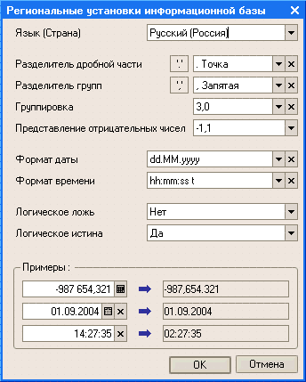 Настройка региональных установок информационной базы позволяет управлять форматом отображения даты, времени, чисел и логических констант в прикладном решении: