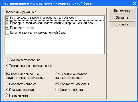 Процедура позволяет выбрать проверки и режимы, которые должны быть выполнены для текущей информационной базы. Для баз, использующих клиент-серверный вариант, возможна проверка логический целостности данных и пересчет итогов. Для баз, использующий файловый вариант, в дополнение к этим проверкам, может быть выполнена реиндексация таблиц и сжатие информационной базы.
