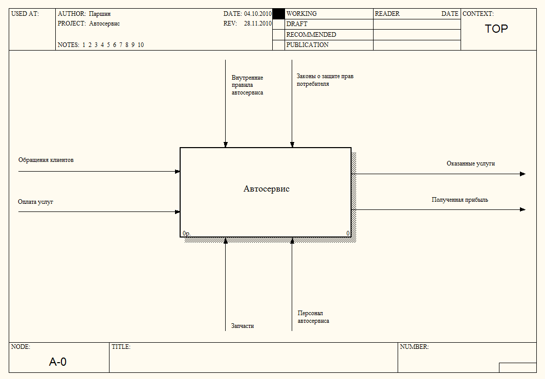 Взаимодействие системы с окружающей средой описывается с помощью входов («Обращения клиентов» и «Оплата услуг»), выходов («Оказанные услуги» и «Полученная прибыль»), управления («Законы о защите прав потребителя» и «Внутренние правила автосервиса») и ресурсов («Запчасти» и «Персонал автосервиса»).