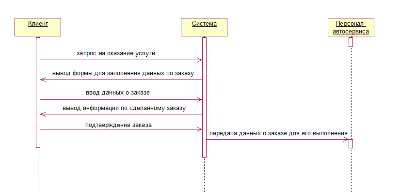 Данная диаграмма описывает последовательность во времени событий, происходящих в системе при выполнении клиентом запроса на оформление заказа.
