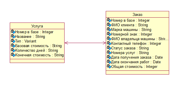 2. Заказ. Данный класс имеет атрибуты: номер в базе, ФИО клиента, марка машины, номерной знак, ФИО владельца машины, статус заказа, контактный телефон, номера услуг, статус заказа, общая стоимость, дата окончания работ, дата получения заказа.