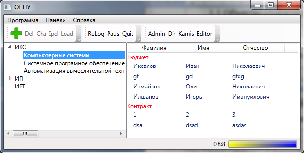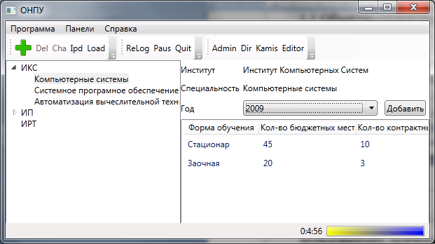 В окне редактора институты и их специальности представлены в виде дерева. При выборе специальности мы видим распределения мест. Все данные в окне могут быть изменены а так же добавлены новые записи.
