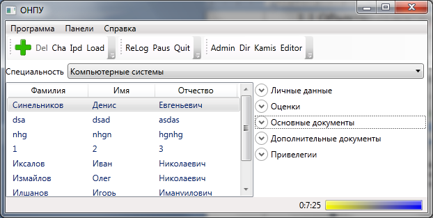 В главном окне программы находится меню, а так же несколько панели с помощью которых можно осуществлять общие действия для всех ролей. В правом углу находятся кнопки для перехода в разделы предназначенные для каждой из ролей.