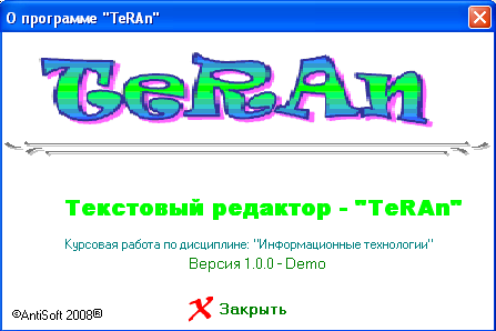 Данная программа представляет собой текстовый редактор, предназначенный для набора, редактирования и форматирования текста. Сначала необходимо скопировать все файлы, входящие в программный пакет на жесткий диск (все файлы должны находиться в одной папке). Для начала работы с программой следует запустить файл TeRAn.exe, после чего появится сразу главная форма с полем для редактирования. Затем выбирайте нужные для вас действия, следуя всплывающим подсказкам, и подсказкам появляющимся в строке состояния.