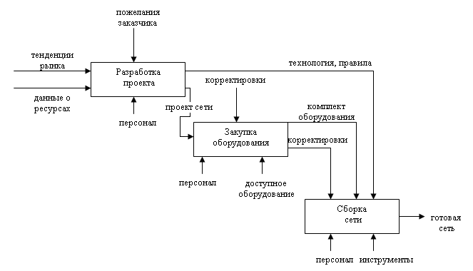 Нужно заметить, что здесь и далее на входе будет результат предыдущих процессов, как то - на этапе закупки оборудования мы пользуемся разработанной ранее схемой. К ней на входе добавляются деньги, выделенные на закупку оборудования. Ресурсами является всё оборудование, предоставляемое поставщиками, управляющим фактором – соответствие комплектации. На выходе мы получаем набор оборудования для конкретно нашей сети.