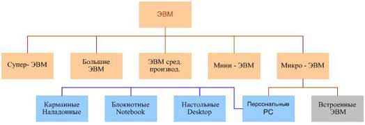 К персональным компьютерам относятся настольные и переносные ПК. К переносным ЭВМ относятся Notebook (блокнот или записная книжка) и карманные персональные компьютеры (Personal Computers Handheld - Handheld PC, Personal Digital Assistants – PDA и Palmtop).