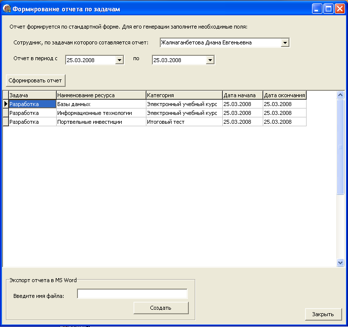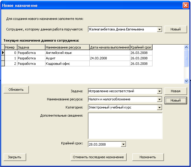 Задачи по созданию электронных образовательных ресурсов назначаются начальником ЦПК, при этом необходимо указывать крайний срок выполнения работы. Сотрудник может выполнить задание раньше или позже назначенного срока, но в любом случае он должен указать период в виде даты начала и окончания работ.