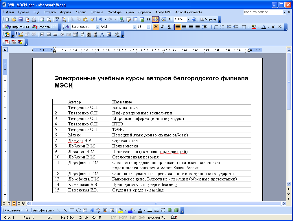 Приложение 8. Пример отчета по электронным учебным курсам, написанным авторами белгородского филиала МЭСИ