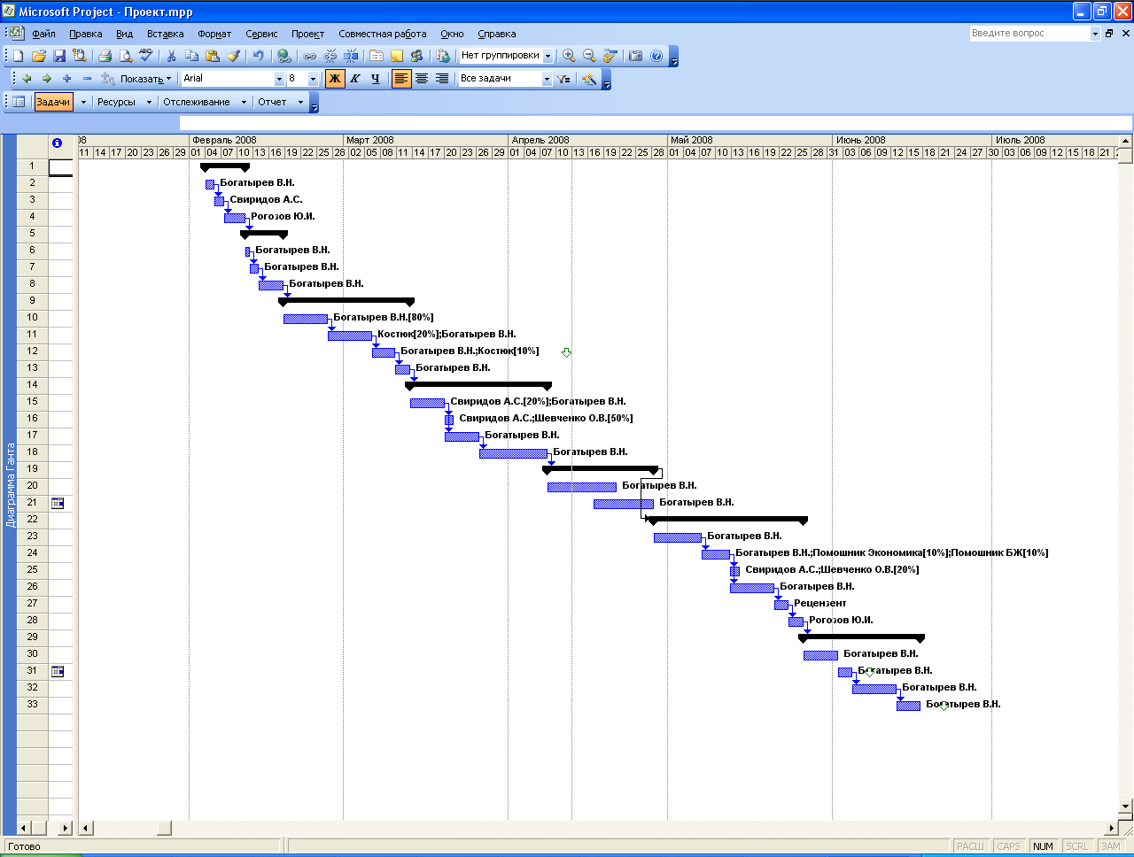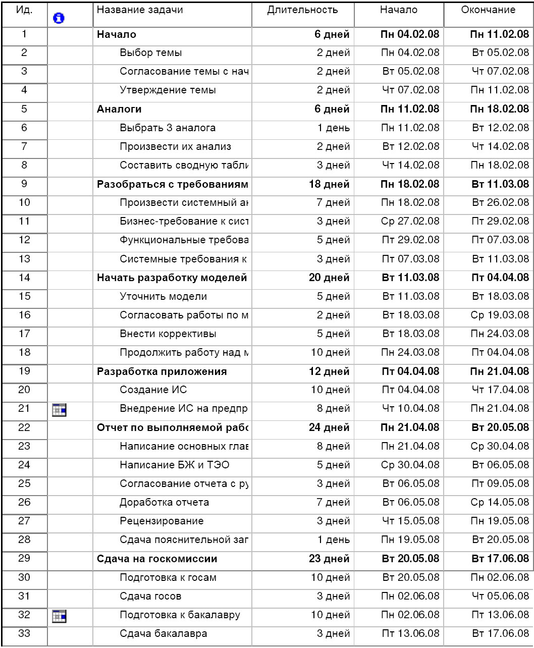 Я выбрал пятидневную рабочую неделю и дату начало проекта – 04.02.2008. Окончание проекта намечено на 17.06.2008, что является приемлемым значением, для даты окончания проекта. Данная дата соответствует реальным срокам сдачи бакалаврской работы.