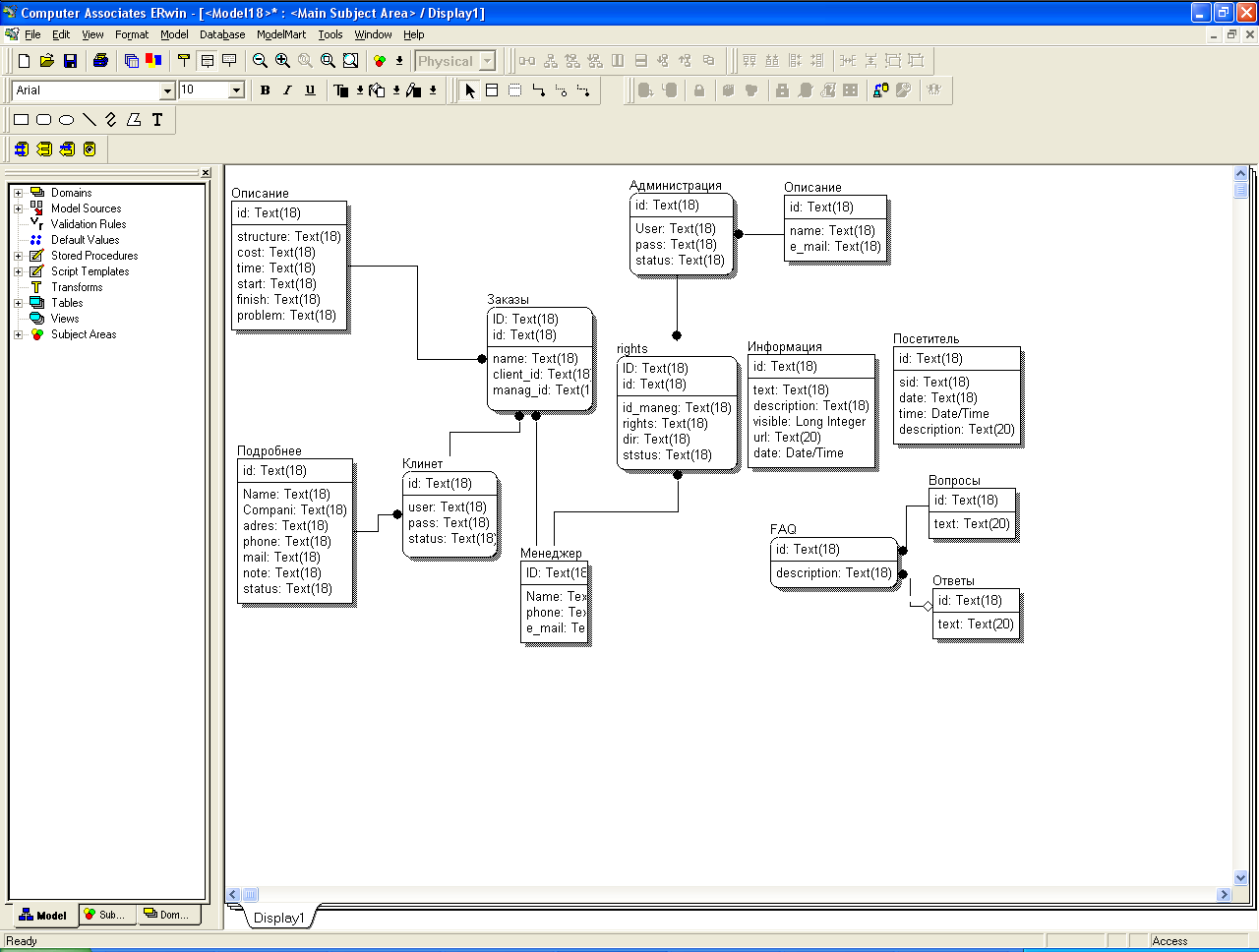 Сущность «Заказы» и связанная с ней сущность «Описание» определяют атрибуты необходимые для описания заказов. Атрибут client_id и manag_id необходимы для связывания сущности «Заказы» с сущностями «Клиент» и «Менеджер». Сущность «rights» необходима для назначения прав и областей доступа для менеджера и администрации. Сущность «Администрация» и связанная с ней сущность «Описание» содержит атрибуты для описания администратора системы. Атрибуты«User», «pass» и «status» необходимы для авторизации и аутентификации пользователя в системе.