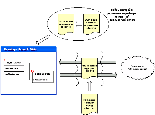 В процессе редактирования визуальные образы объектов заполняются данными, между объектами устанавливаются связи. Результат своей работы пользователь конструктора может сохранить либо в виде диаграммы Visio, т.е. в файле с расширением vsd, либо в XML файле описания структуры объектов, представляющем разработанную объектную модель (или её часть) в специально разработанном для этого XML языке. Vsd файл можно использовать лишь для дальнейшего конструирования модели в редакторе, в то время как XML представление может быть передано соответствующему приложению для изменения состояния объектной модели (рис. 1). Ясно, что такое приложение должно поддерживать API интерпретации XML языка описания объектной модели. Фрагменты модели для редактирования «поступают» от соответствующего приложения также в виде подобных XML документов.