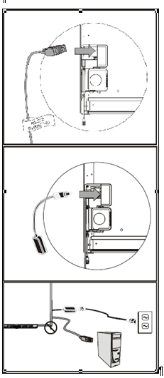 - Один конец кабеля питания вставьте в блок питания, а другой конец кабеля вставьте в розетку. Индикатор готовности загорится красным