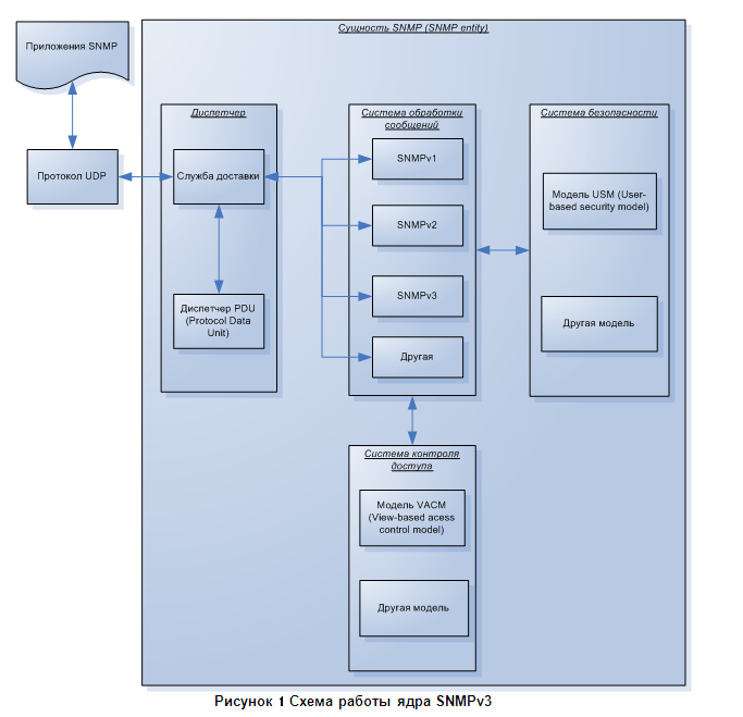 В данной версии реализована модель, базирующаяся на процессоре SNMP (SNMP Engene) и содержащая несколько подсистем (дипетчер, система обработки сообщений, безопасности и управления доступом, см. рис. 4.4.13.4).