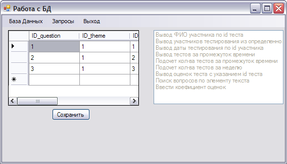 Пример окна после выбора пункта меню-база данных-таблицы-вопросы